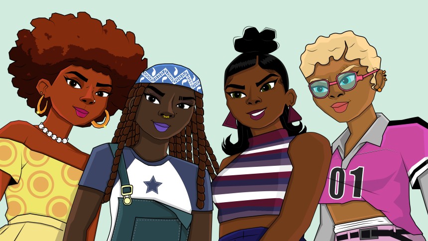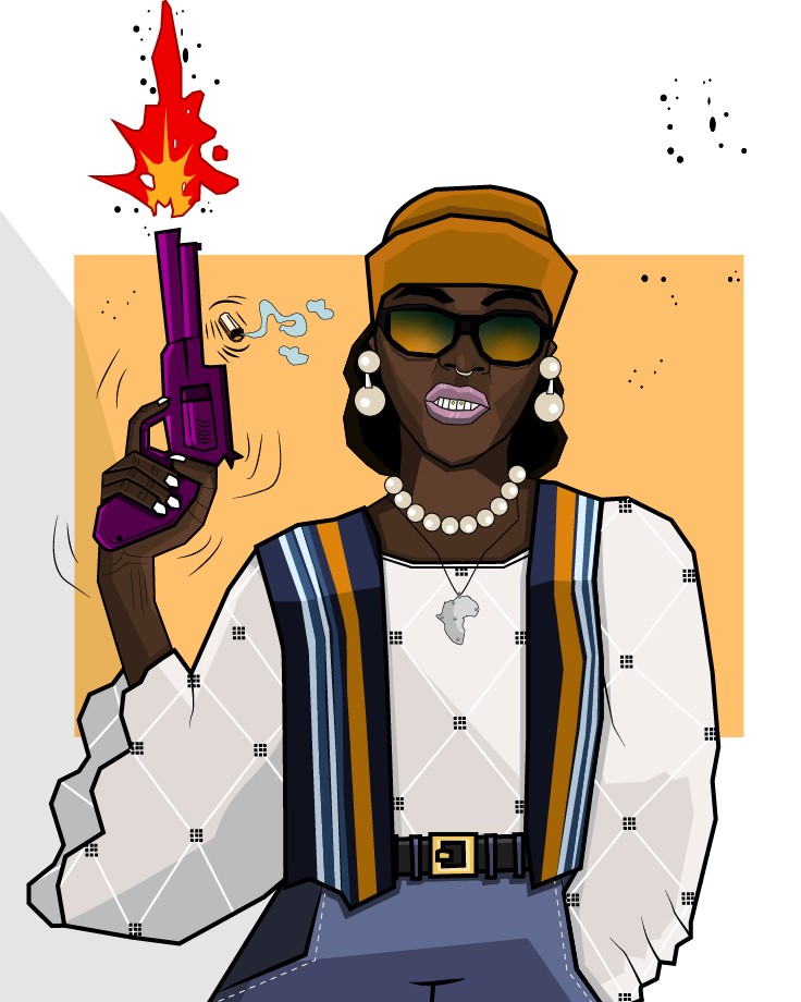 Melanin Ride is a digital illustration of a young lady leaning against a vintage yellow Cadillac, wearing a black and white cropped blouse...